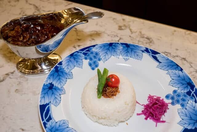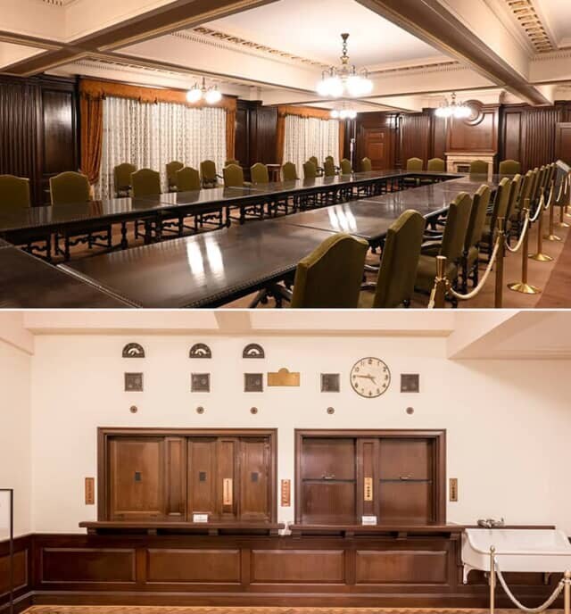 椅子がずらりと並ぶ食堂は、テレビドラマの会議室に出てくるような上質な雰囲気。細かな装飾が施された天井も見どころです。写真下は隣接する配膳用の小部屋で、木製の扉がついた小型のエレベーターで地下の厨房から料理を運び上げる仕組みです。