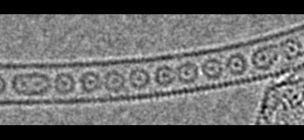 上の図では電子ビームを当てることでフラーレンの籠がだんだん融合していき、最終的にはカーボンナノチューブの内部に、複数のクリプトンが収められた細長いカプセルが出現する様子が映されています。