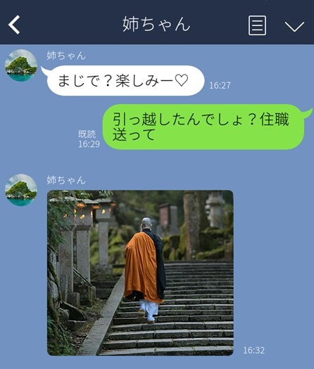 なので、引っ越し先の『住所』を送ってほしかったんですけど、『住職送って』って打ち間違えてしまって。ヤバイと思ってすぐ送信取り消ししようとしたんですが、すかさず姉が住職の写真を送ってきました。悔しいけどめちゃくちゃ爆笑しましたね(笑)」(29歳・男性)
