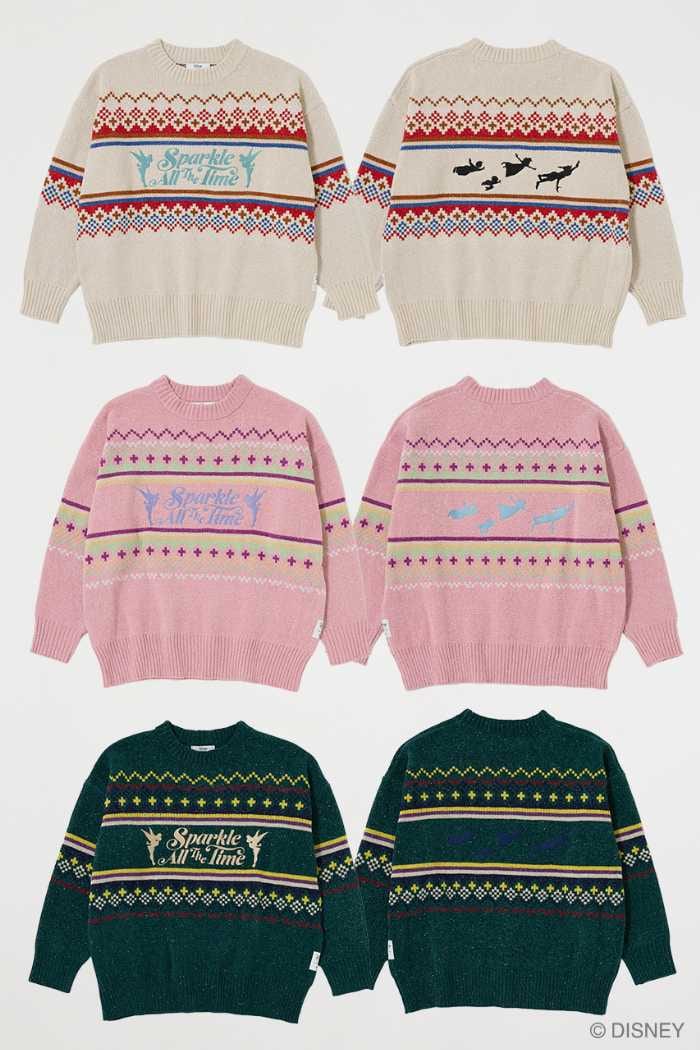 今回のコレクションでは、ティンカー・ベルの金の粉をイメージしたラメ糸を織り込んだユニセックスサイズのニットが主役に。