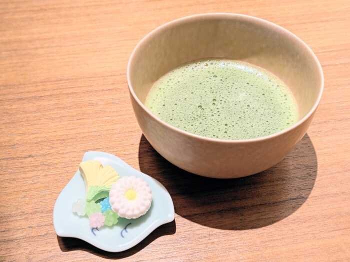 ドリンクと干菓子がセットになった「一服一煎セット」は、一服一銭の背景の通り500円のワンコインです。ご近所の老舗抹茶屋「柳桜園茶舗」の抹茶は、干菓子と相性抜群です。