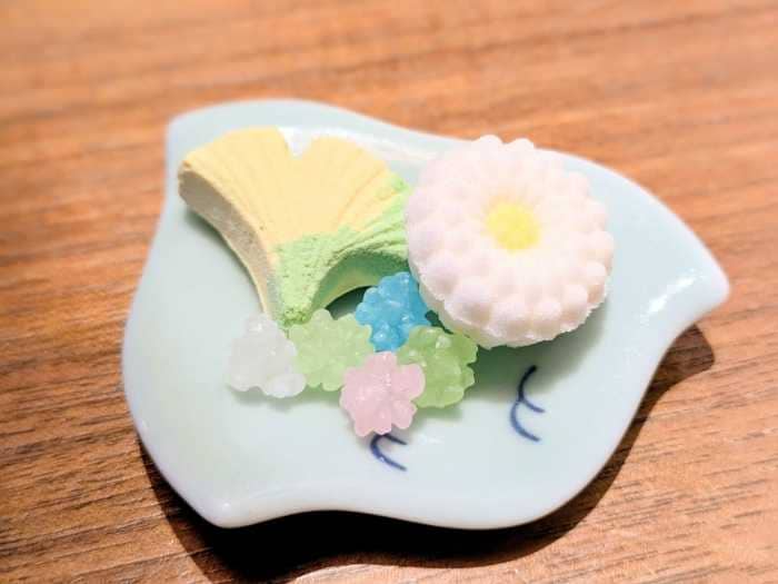 かわいらしい形の干菓子は、老舗和菓子屋「二條若狭屋」の干菓子です。