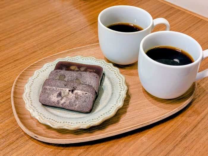和菓子は「二條若狭屋」や「鶴屋吉信」をはじめとした名店から、季節ごとに厳選した和菓子がいただけます。取材した11月は、鶴屋吉信の「栗羊羹」でした。秋の味覚の王様「栗」を使用した羊羹は、珈琲と相性抜群です。