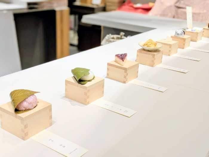 和菓子屋をイメージした中央の屋台には、12か月分の季節の和菓子が飾られています。