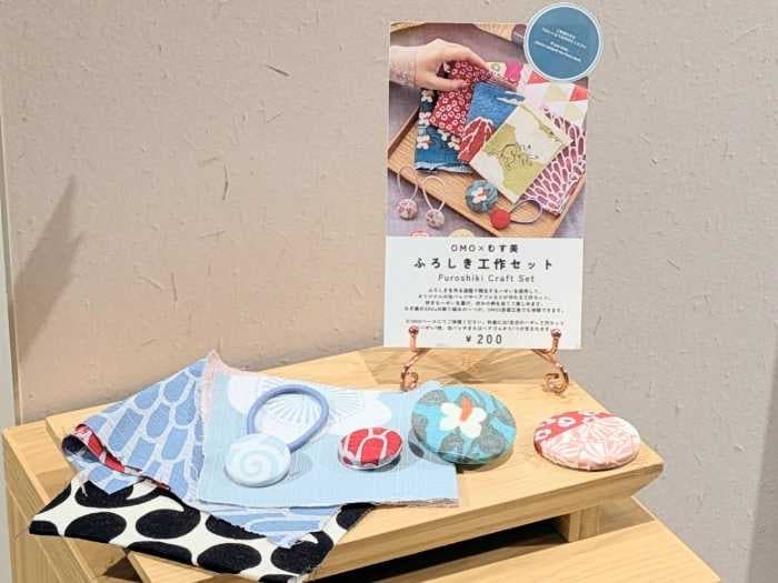 含まれるもの:ふろしき工作セット1名分(風呂敷はぎれ1枚、缶バッジ、ヘアゴム、ボタンから1つ)