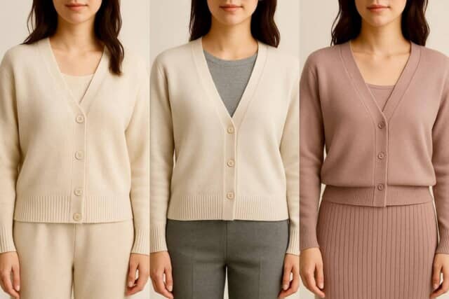 今っぽく見せるなら、ニュアンスカラー同士の組み合わせが最適。例えば、くすみベージュのカーデに白のインナーを重ねるなど、“軽さ”と“抜け”を意識した配色が大人に似合います。