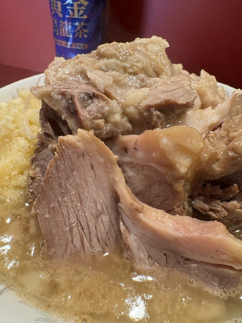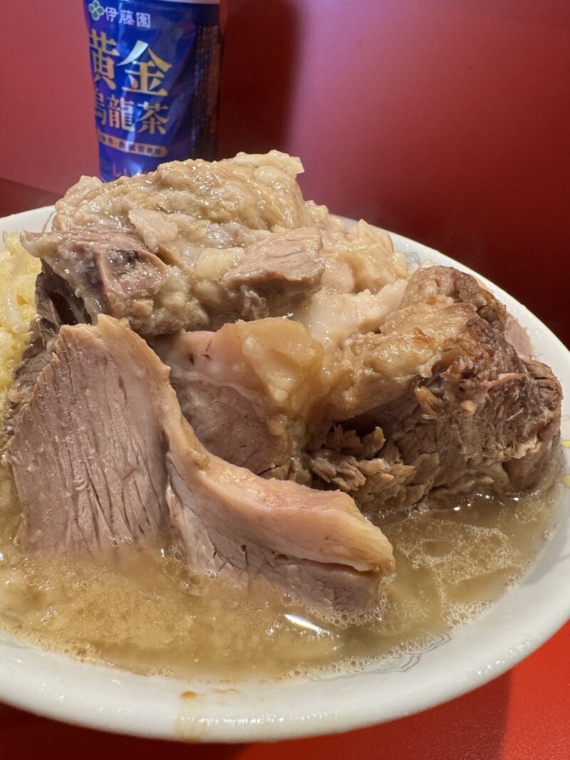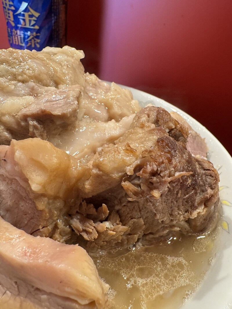さっそく食べる。ラーメン二郎の中でもトップクラスの限りなく優しいテイスト。麺をサルベージすると、極厚の油膜を通過して味覚を訪れるため、麺クニュ度が極まったソフトな食べ心地となる。そもそも麺自体のクニュとした質感が食べていて心地良い。もしかすると、ラーメン二郎全店舗のなかでもダントツのクニュ感かもしれない。