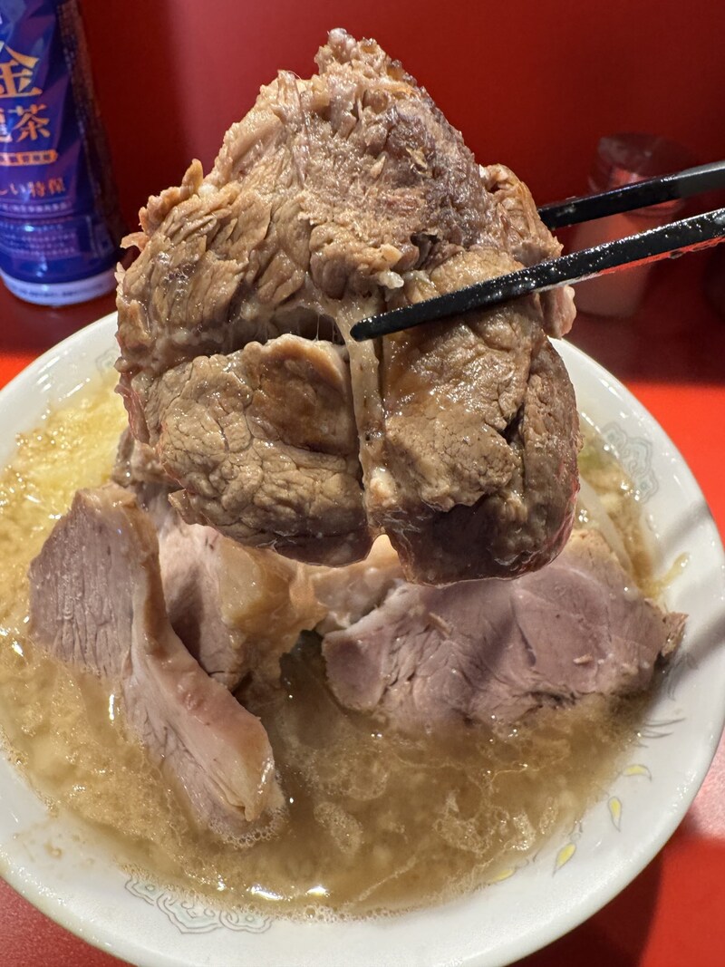 豚温度は低めなので、スープに浸して温めて食べるのもアリ。ラーメン二郎名古屋大曽根店のミルキィ汁をたっぷり吸わせた豚も良き。