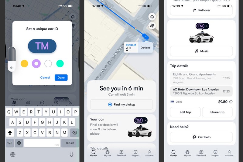 最初にunique car IDを設定しておけば、車両上部、いわゆる行灯の部分にそのイニシャルを表示しながらやってくる。Uberだと車種やナンバープレートで識別し、最終的には乗る時に運転手の名前で間違いがないか確認するが、同じ車両がたくさん走ってるWaymoの場合はこのunique car IDが頼りというわけだ。