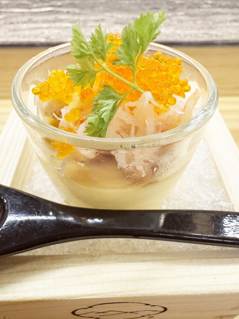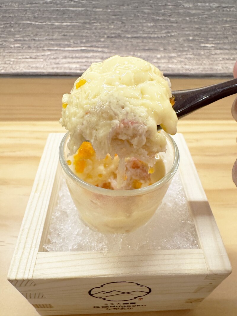やってきた蟹プリン。プリンの上に蟹がのっているのですが、酒枡に入っていて、雰囲気が和風です。単にガラスの器で出されるより気分がアガります。嬉しい。