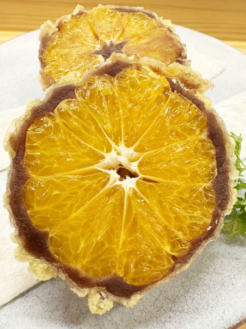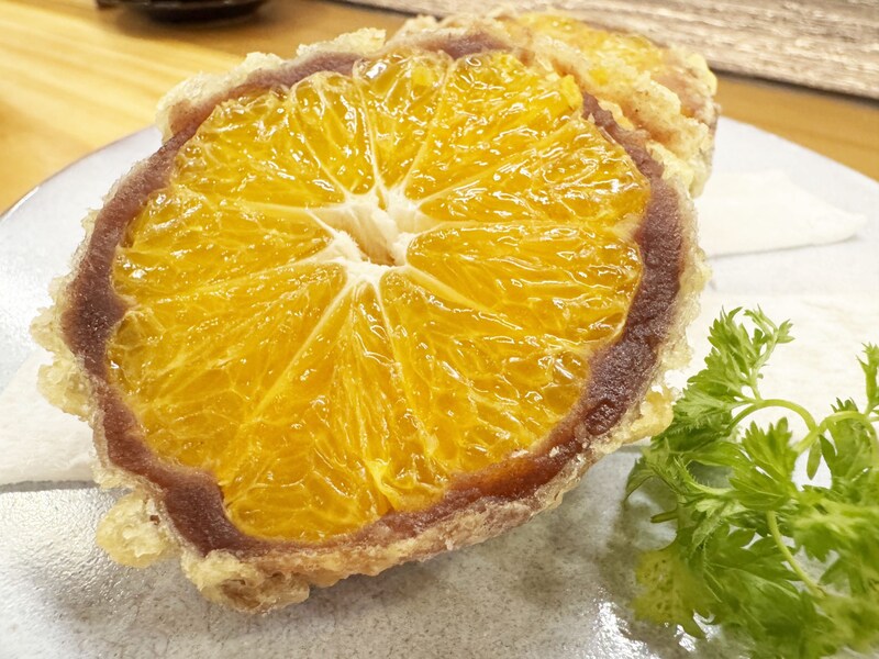 このミカンの天ぷら、ひとくちでガブリと一気に食べることで、そのおいしさが本領発揮となります。大量のミカン果汁があふれ出し、天ぷらの衣と相まって、フレッシュ感と心地良い甘味、そして爽やかなエキスにノッたコクが楽しめるのです。素晴らしい。