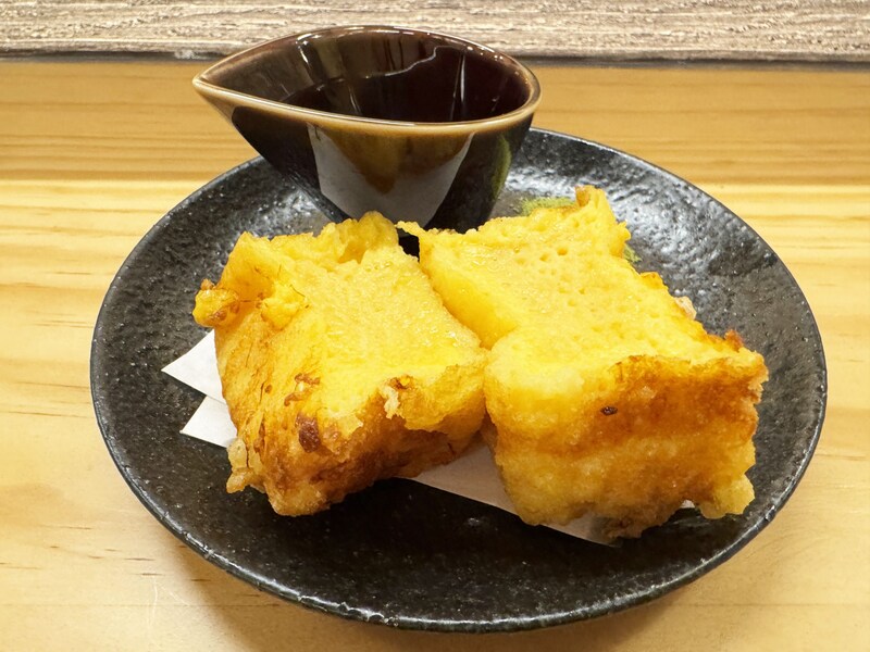 フレンチトーストの天ぷらは、なかなかの個性派。パンが揚げ油を吸収しているのでオイリーではあるものの、キリッと強めのドリンクとともに食べれば、最高のツマミになりそう。