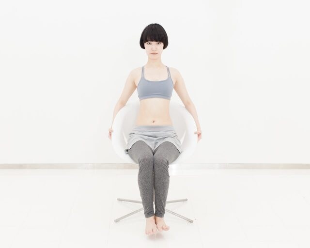 (1)椅子に背筋を真っ直ぐ伸ばして浅めに座り、椅子のひじ掛けを両手で持ってバランスを取りながらひざを上げ、足の裏を床から5〜10cm程度浮かす