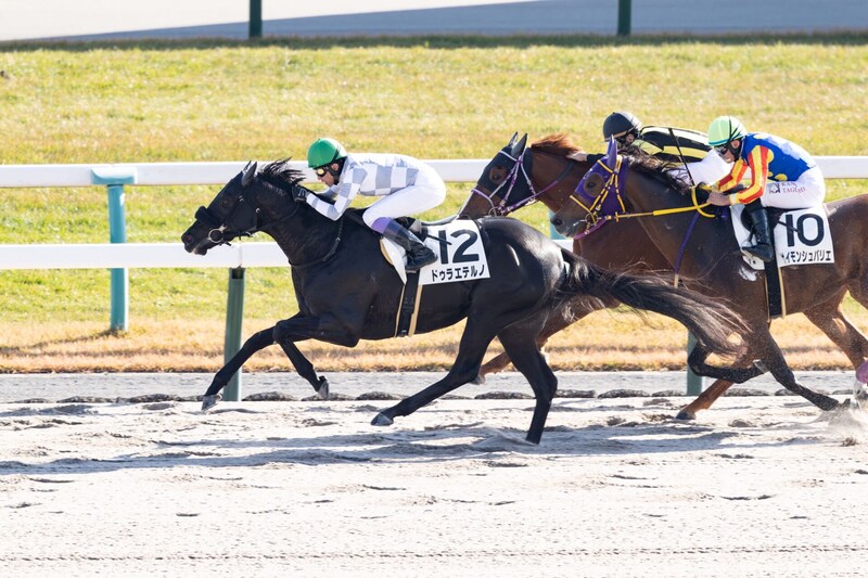 11月30日、京都競馬場で行われた7R・3歳上1勝クラス(ダ1800m)は、武豊騎乗の3番人気ドゥラエテルノの力強い差し切りが決まった。後方待機から長くいい脚を使い、ゴール前でライバルをねじ伏せた。