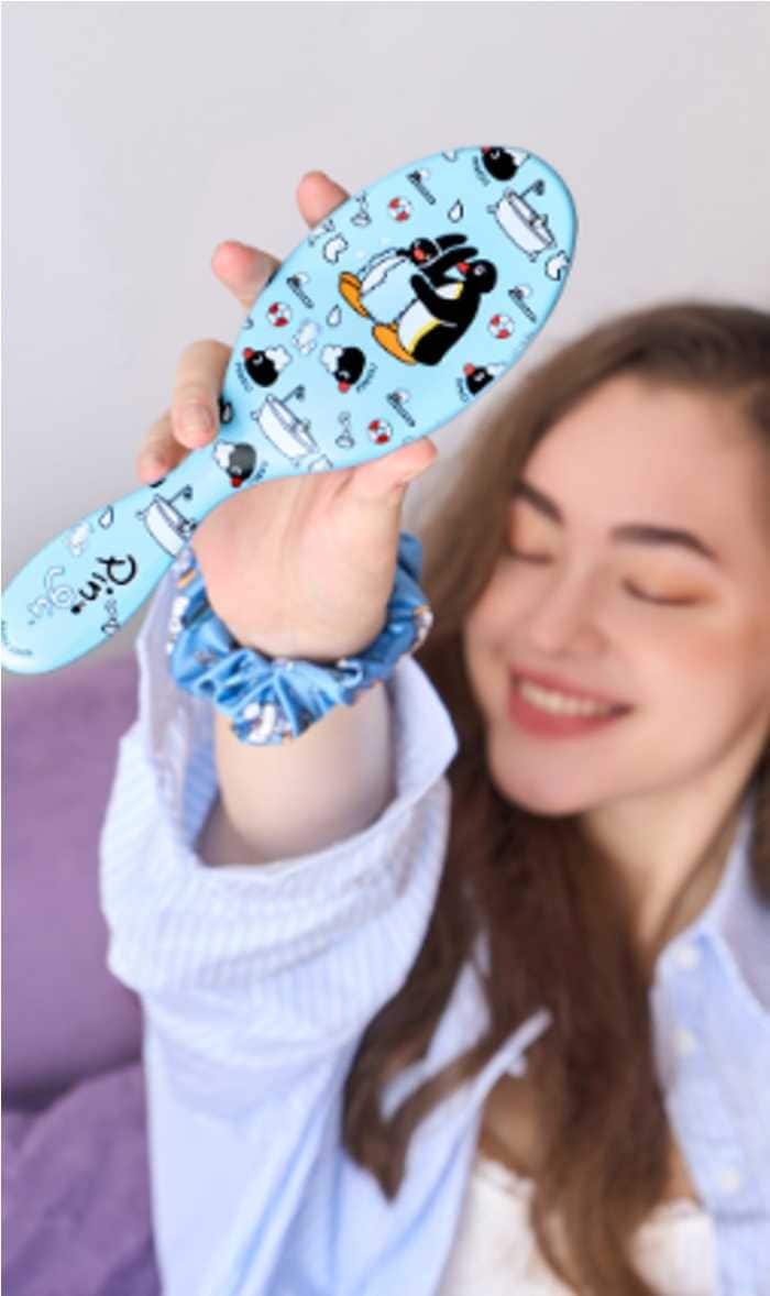 「ウェットブラシ ピングー オリジナルディタングラー シュシュ付き」(1,980円)は、絡まりやすい髪質の人におすすめ。