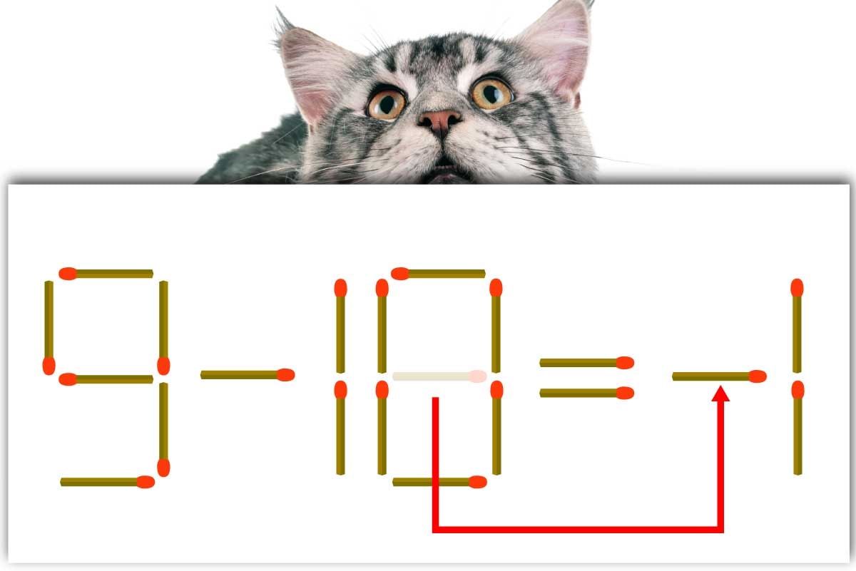 「8」のマッチ棒を1本、「=」の後ろに移動させて「-」を作り、「9-10=-1」にする。※解答は複数ある場合があります。