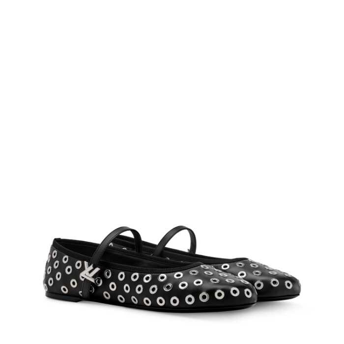 「ロミー バレリーナ」(180,400円)は、しなやかなラムレザーにシルバーカラーのアイレットを配した、鎧を思わせる気品漂う一足。