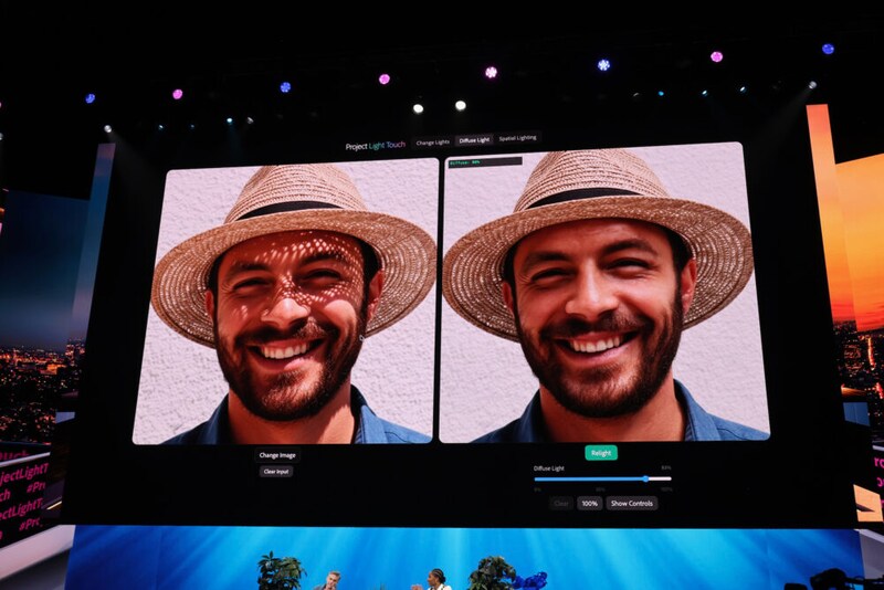 麦わら帽から漏れた光が複雑に当たっている写真を、ディフューザーをかけて柔らかくしたようなライティングに変更できた。そればかりか光源の位置を自由に変更できる。