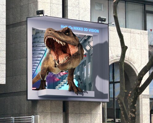 博多日光3Dビジョンは、博多駅筑紫口から徒歩3分の好立地にあり、月間約280万人が行き交うエリアに位置しています。今後も話題性の高い3Dコンテンツを順次リリース予定。