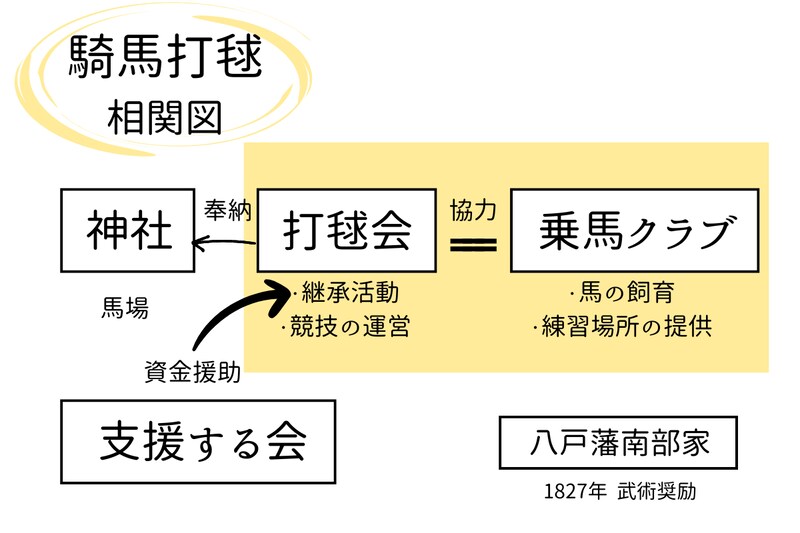継承に取り組むのは主に2団体。騎手の育成や競技の奉納を担う八戸騎馬打毬会、馬の飼育や乗馬の練習の場を提供する乗馬クラブ「POLOライディングクラブ」です。このほかに、競技を「奉仕(奉納)」してもらう神社が、馬場を管理しています。