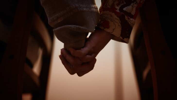 “仲のいいパートナーは近くにいるだけで⼼拍数が重なる”という研究結果をもとに、男⼥がお互いの顔を⾒ないまま⼿を繋いだ時、⿎動がどのように変化するのかを表現している。