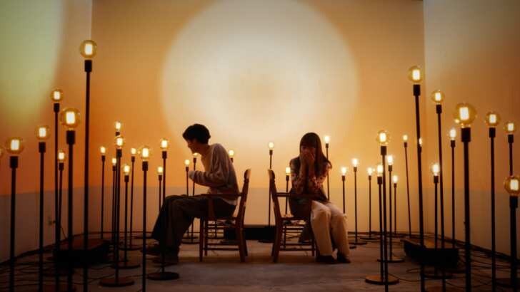 クライマックスでは、男性の真のパートナーである⼥性が背後の椅⼦に座り⼆⼈が⼿を繋ぐと、⿎動と光がゆっくりシンクロし始める。