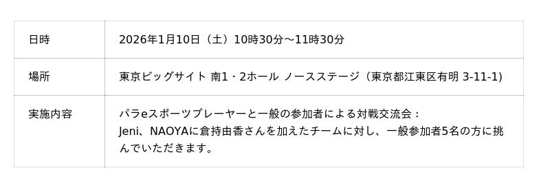 2026年10日(土)、東京eスポーツフェスタ2026のステージイベント「パラeスポーツプレーヤーとのエキシビションマッチ」に、株式会社ePARA(本社:埼玉県戸田市、代表取締役:加藤大貴)所属の難病格闘ゲーマー・Jeniとブラインドeスポーツプレイヤー・NAOYAが出演いたします。