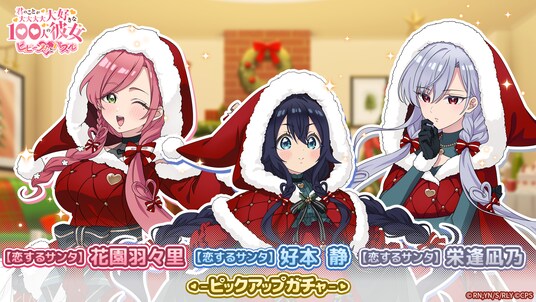 ポッピンゲームズジャパン株式会社は、TVアニメ『君のことが大大大大大好きな100人の彼女』(以下、『100カノ』)初のスマートフォン向けゲームアプリ『君のことが大大大大大好きな100人の彼女 ビビーン!!とパズル』(以下、『100パズ』)で、本日2025年12月1日(月)より、「【恋するサンタ】好本 静&栄逢凪乃&花園羽々里ピックアップガチャ」を開催しました。ピックアップガチャでは、サンタ衣装を着たキャラクターが登場します。