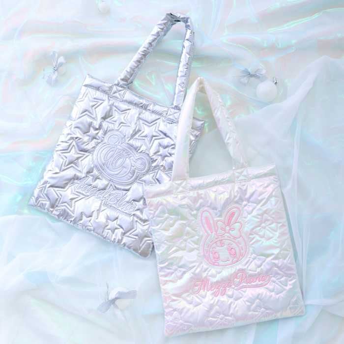 存在感たっぷりの「キラキラキルティングトートバッグ」(全2種・6,600円)は、ベリエちゃんはホワイトオーロラ×リボン柄、ナカムラくんはシルバー×星柄のデザイン。