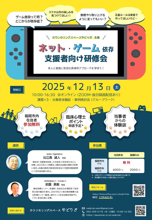 カウンセリングスペースやどりぎ(所在地:福岡県福岡市東区、運営:特定非営利活動法人ジャパンマック、代表理事:岡田 昌之)は、2025年12月13日(土)に『ネット・ゲーム依存支援者向け研修会』をオンラインにて開催致します。