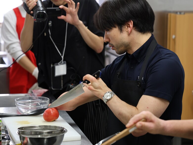 左手の3本の指で鉛筆を握るように包丁を持ち、食材を切る©Tokyo Metropolitan Government