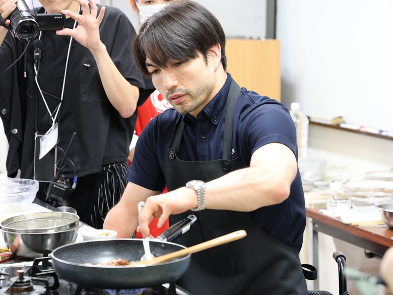 鈴木選手が実際に使っているレシピで、調理の様子を披露。指が欠損している右手で食材や瓶、フライパンなどを押さえたり支えたりし、3本の指がある左手で包丁やレードルをつかんだり、瓶のふたを開けたりする。