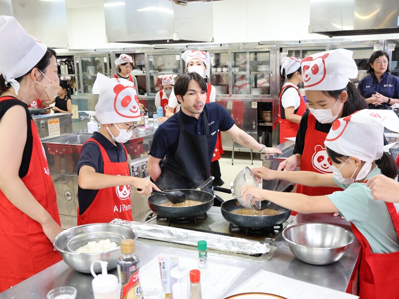 実際に麻婆豆腐を作る親子の様子を見て回る©Tokyo Metropolitan Government
