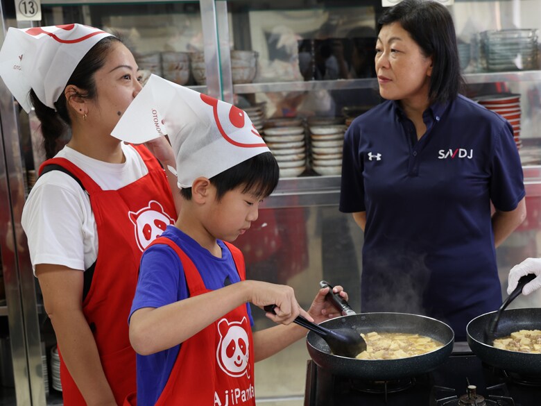 参加者は味の素社のキャラクターのエプロンと三角巾を着けて調理した©Tokyo Metropolitan Government