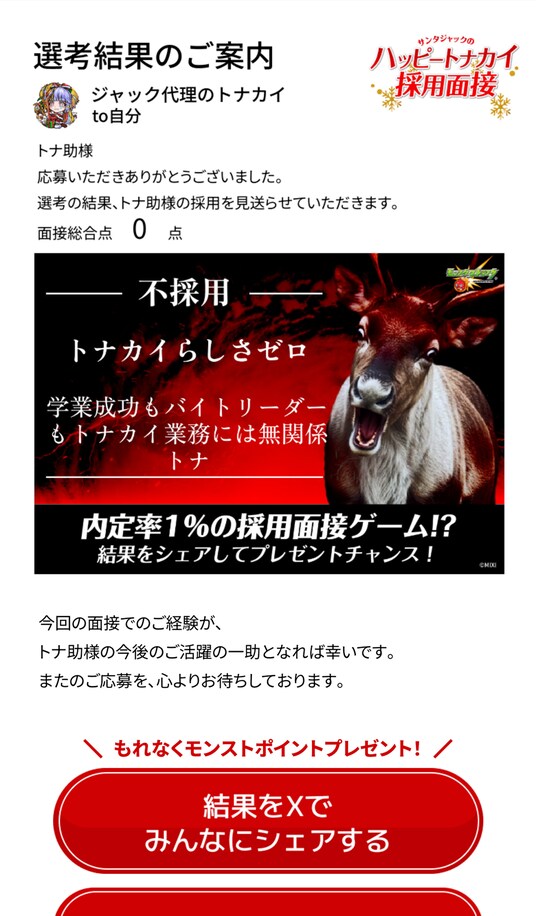 また、惜しくも内定に至らなかった場合でも、面接結果をXでシェアした方全員に「モンストポイント10ポイント」をプレゼントします。