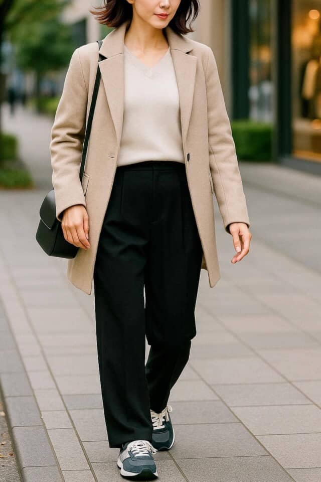 かつて多くの人が履いていた黒パンツは、やや厚手のウール素材で、ストレート気味の重めシルエットが一般的でした。でも、上半身に冬のニットやコートを合わせると、全体が四角くまとまり、重心が下がって見えやすいのが難点。
