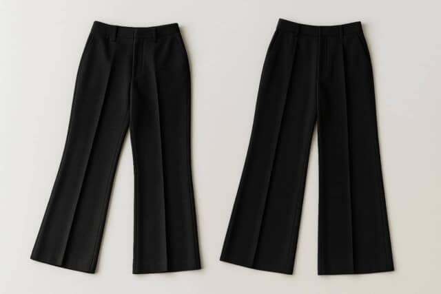 ▲左は“硬め素材×ローウエスト×広がる裾”で重たく見えやすい昔の黒パンツ、右は“とろみ素材×ハイウエスト×落ち感ライン”の今っぽいシルエット。微かな差に見えて、はいた時のスタイルアップ効果は大きく変わる