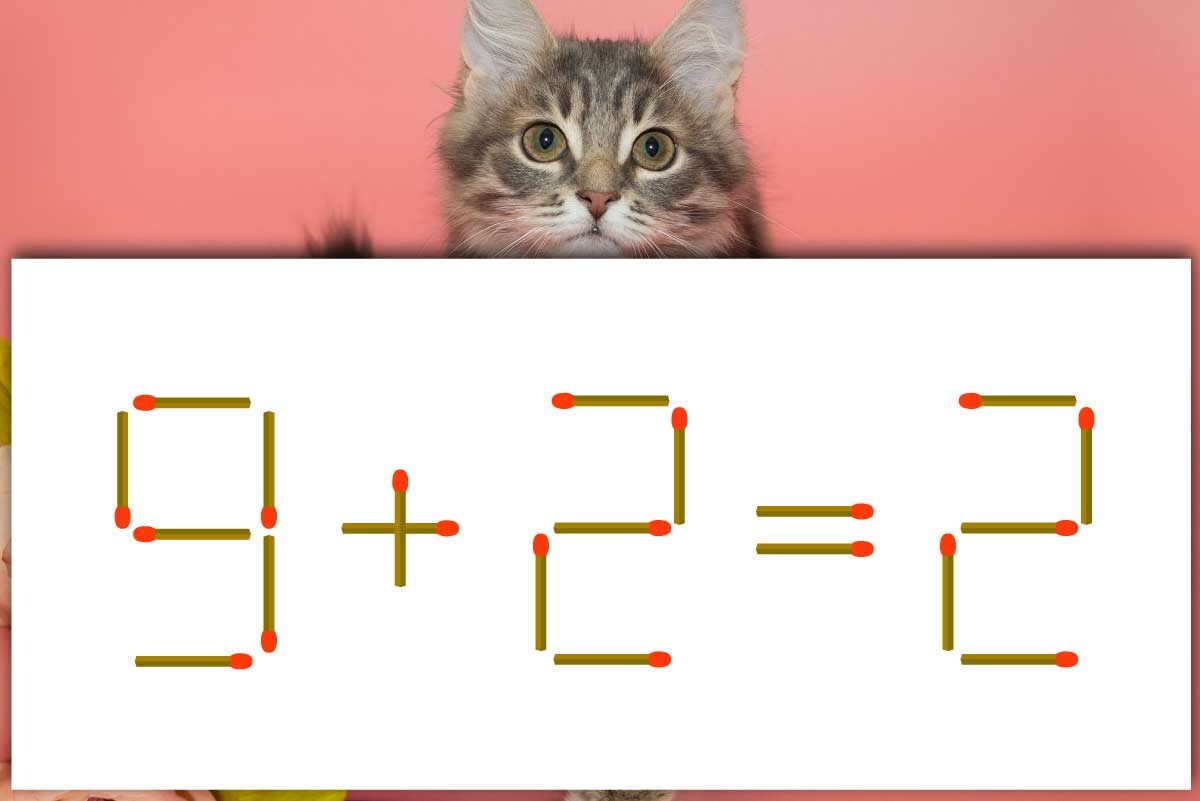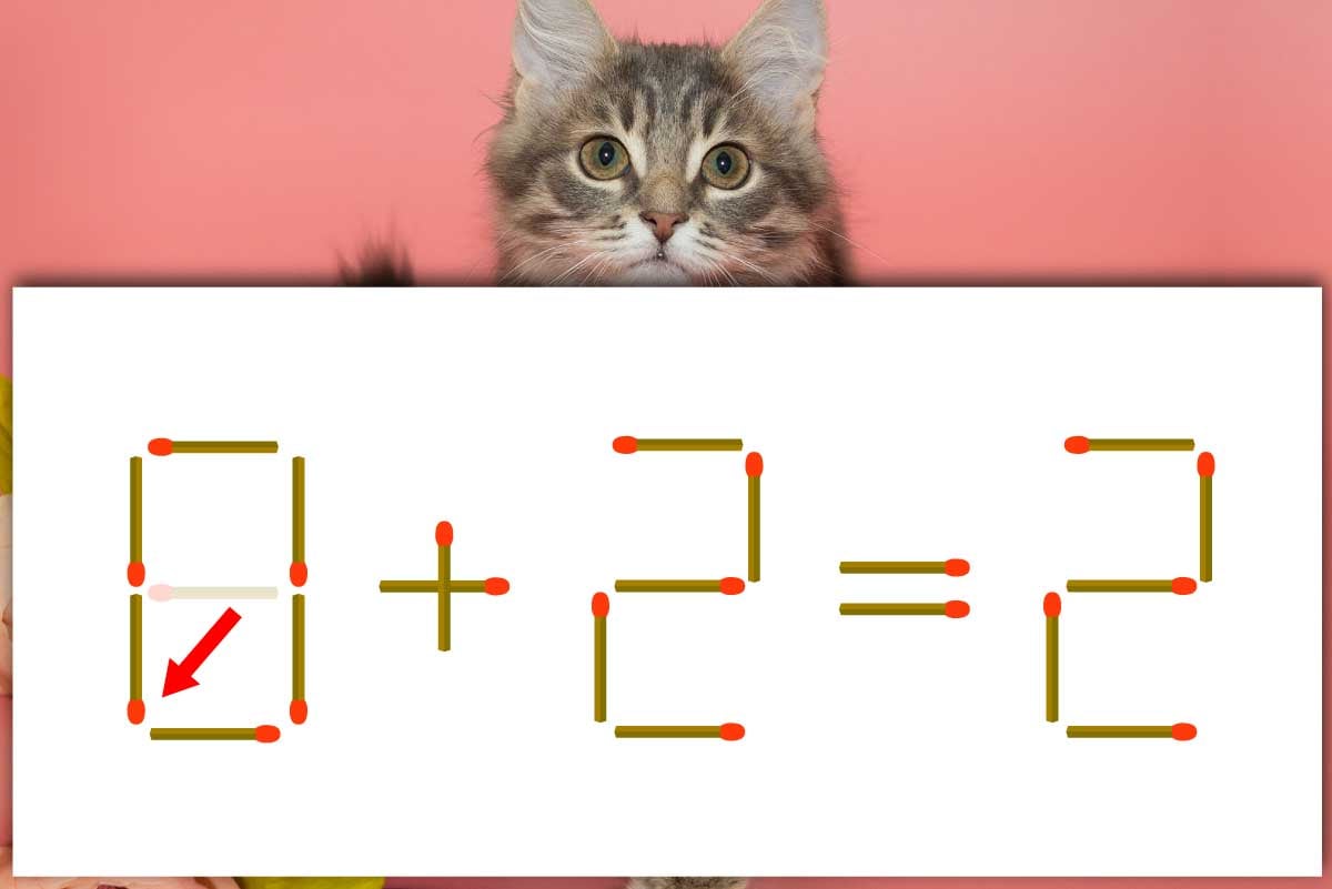 「9」の真ん中にある横向きのマッチ棒を取ります。取ったマッチ棒を縦向きにして、「9」の左下にくっつけます。すると、「9」が「0」へ変化。式が「0+2=2」になり、両辺が一致しました!