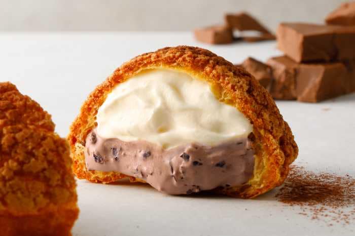 「チーズパフ ショコラ&マスカルポーネ」は、カマンベールチーズクッキーをのせて焼き上げた香ばしいシュー生地に、北海道産生クリームとマスカルポーネで仕上げたまろやかなマスカルポーネクリームをたっぷりIN。