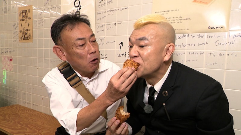 まずは相席するために街を散策。すれ違う人たちにパントマイムで笑いを振りまく姿はまさにサイレントコメディ。街で遭遇した女性に「青森の名産が食べられる所を教えて」とパントマイムで伝えると、人気の市場に案内してくれる。市場ではお父さんとパントマイムで会話し、弘前のソウルフード“イカメンチ”をご馳走になる。