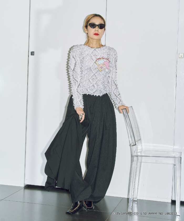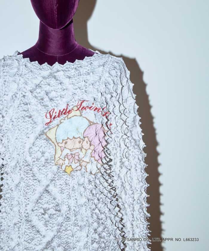 「SPIKY TOPS」(ホワイト/サイズ46/¥35,200税込)は、ポリエステルデシンにプリントされたアラン模様に「リトルツインスターズ」と「あひるのペックル」が舞い降りる一枚。