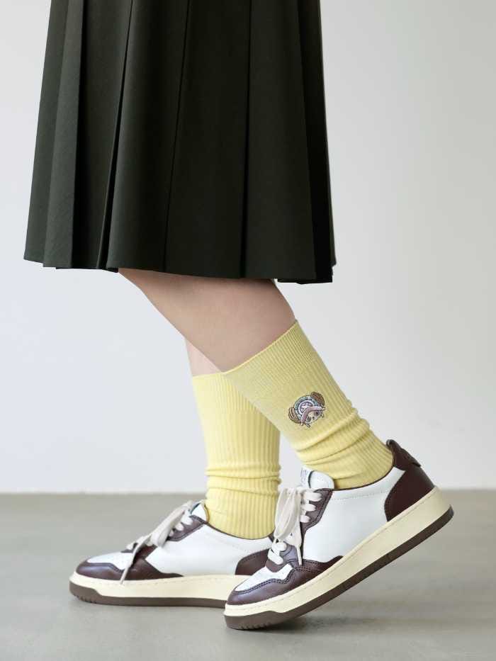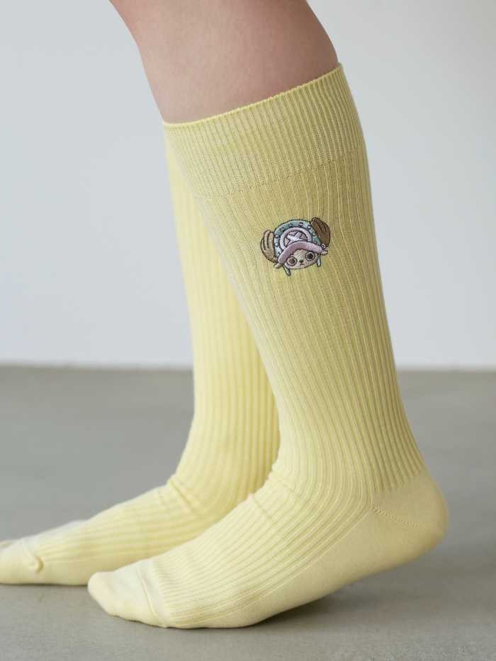 <ONE PIECE “CHOPPER’s” 刺繍スリークォーターソックス>は、無地のスリーク丈にチョッパー刺繍がポイント。メンズライクな丈感とパステルカラーのチョッパー刺繍の相性が抜群です。
