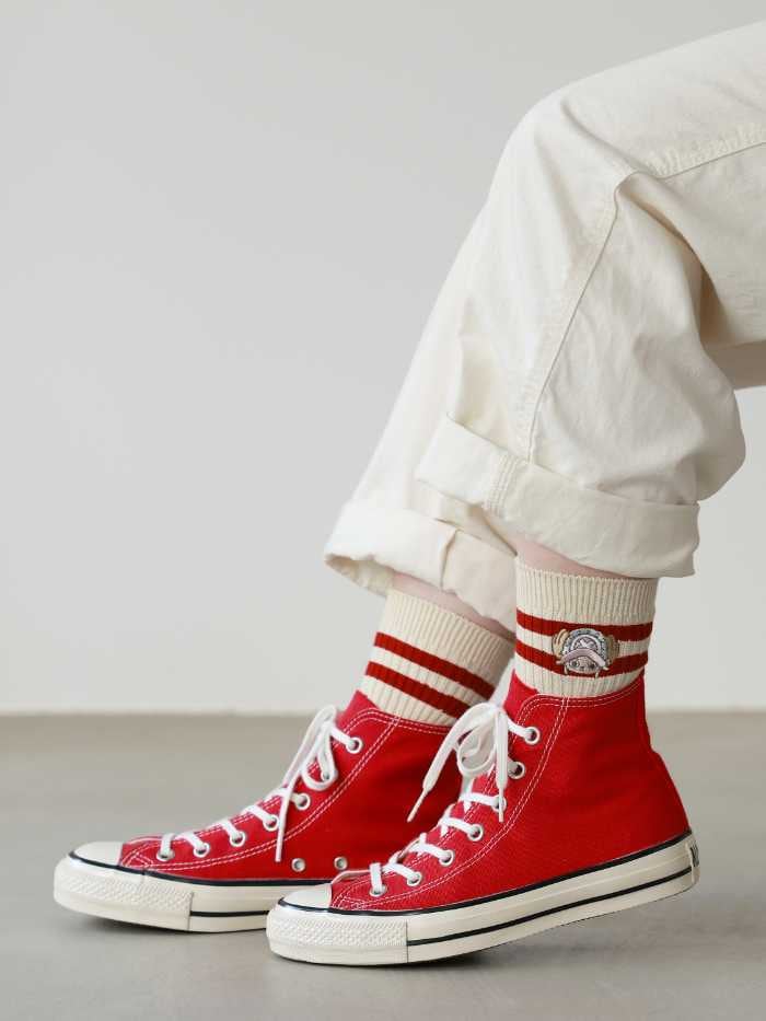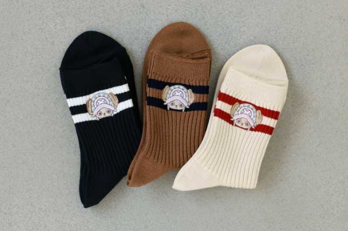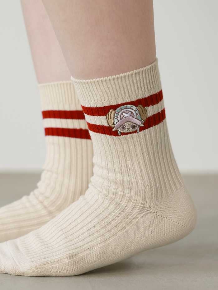 <ONE PIECE “CHOPPER’s” 刺繍2本ラインソックス>は、ローゲージの2本ラインにチョッパー刺繍が施され、カジュアルコーデにさりげなく可愛さをプラス。
