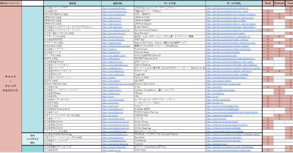 資料請求いただいた方には、カオスマップに加え、「ビジネスツール連携AIサービス提供企業リスト(Excel)」を無償でご提供いたします。このリストは、製品名や製品URLに加え、以下の主要ツールとの連携対応状況をチェック形式で記載しています。
