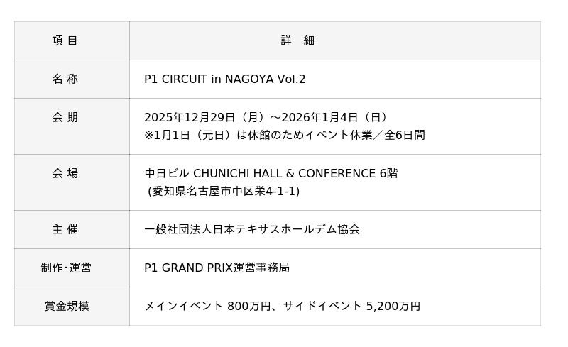 一般社団法人日本テキサスホールデム協会(本社:東京都渋谷区・代表理事 大塚成俊)は、2025年12月29日(月)から2026年1月4日(日)にかけて、中日ビル[CHUNICHI HALL & CONFERENCE]6階(愛知県名古屋市中区)にて『P1 CIRCUIT in NAGOYA Vol.2』を開催します。