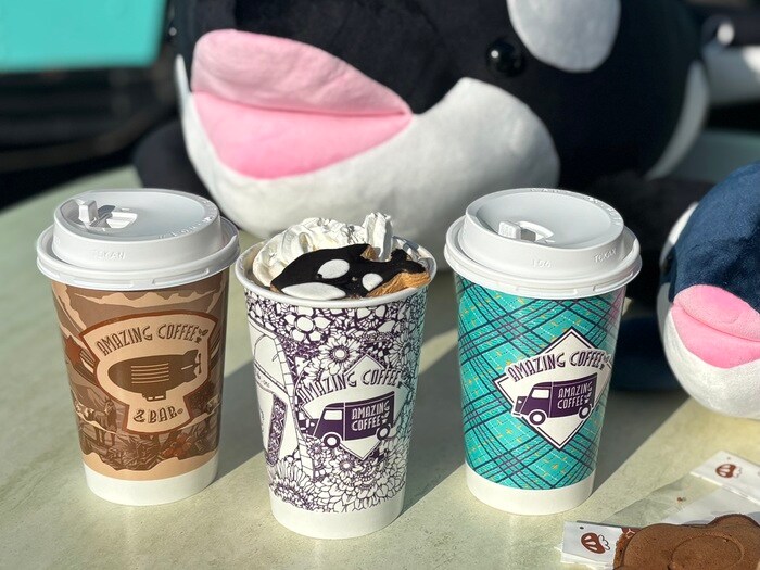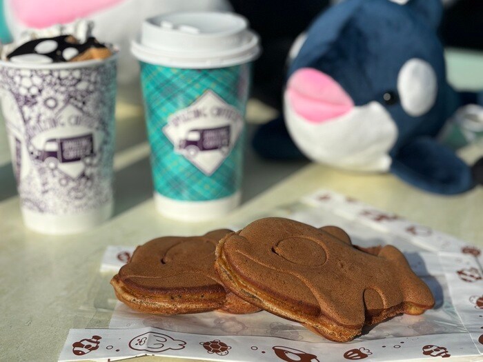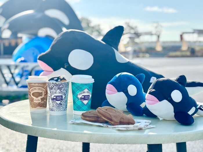 コーヒーメニューの種類も豊富で、カフェラテやハニーラテ、キャラメルラテなどもご用意。ソフトクリームにシャチクッキーがトッピングされた、オルカソフトチョコ&バニラや、オルカソフトいちご&バニラなども販売。