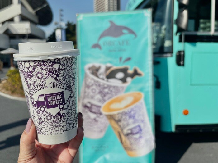 海が似合う「須磨シーワールド」にぴったりなブルーのキッチンカー『ORCAFE produced by AMAZING COFFEE』。コーヒーなどのテイクアウトはもちろんのこと、外観もオシャレなのでフォトスポットとしてもオススメ