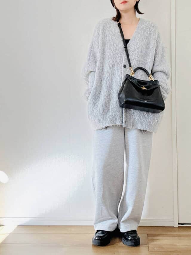 ワントーンでも寂しく見えない理由は、シャギーニット×スウェットの“質感ミックス”。グレーでまとめても華やかに映るのは、この異素材の立体感のおかげです。