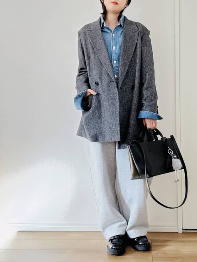 ハリのあるスウェットパンツはジャケットとの相性も抜群。かっちり見えするアウターの印象を柔らげつつ、リラックス感と上品さを両立できます。