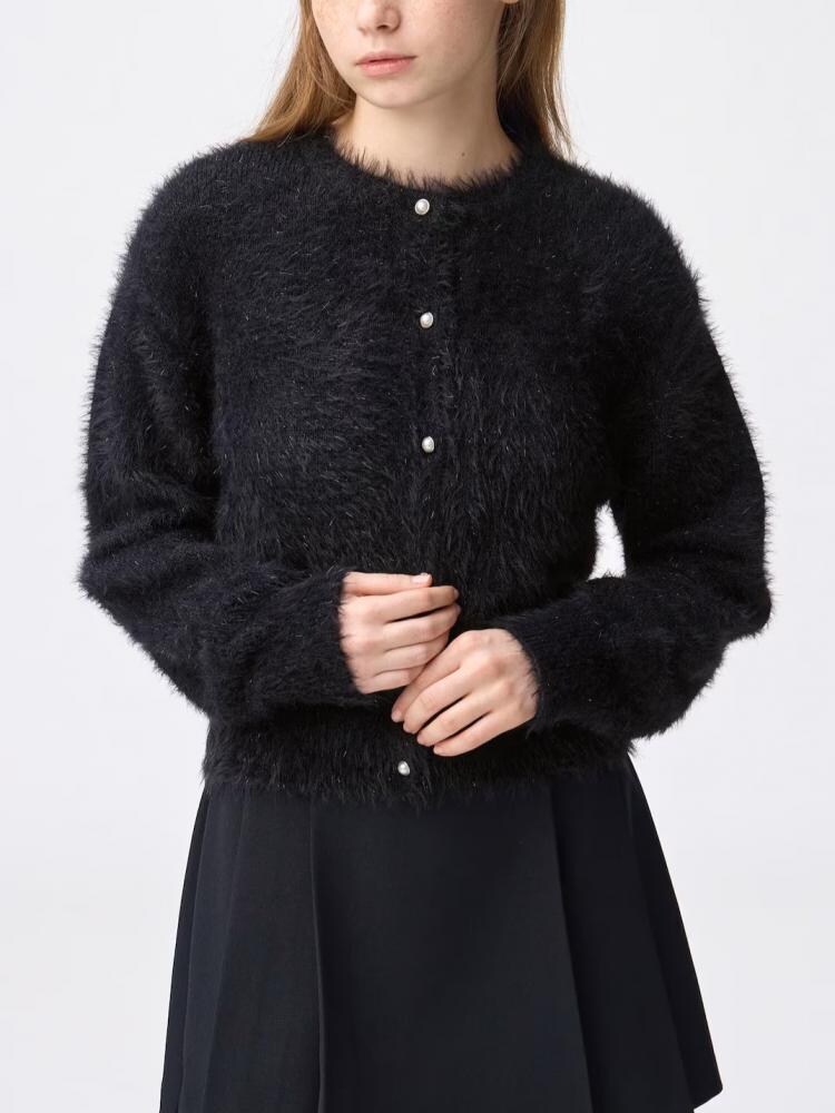毛足の長いフェザーニットに、光沢のある細かいラメとパールボタンがさりげなく光る、エレガントなカーディガン。やわらかな肌あたりに暖かさも兼ね備えた一着です。